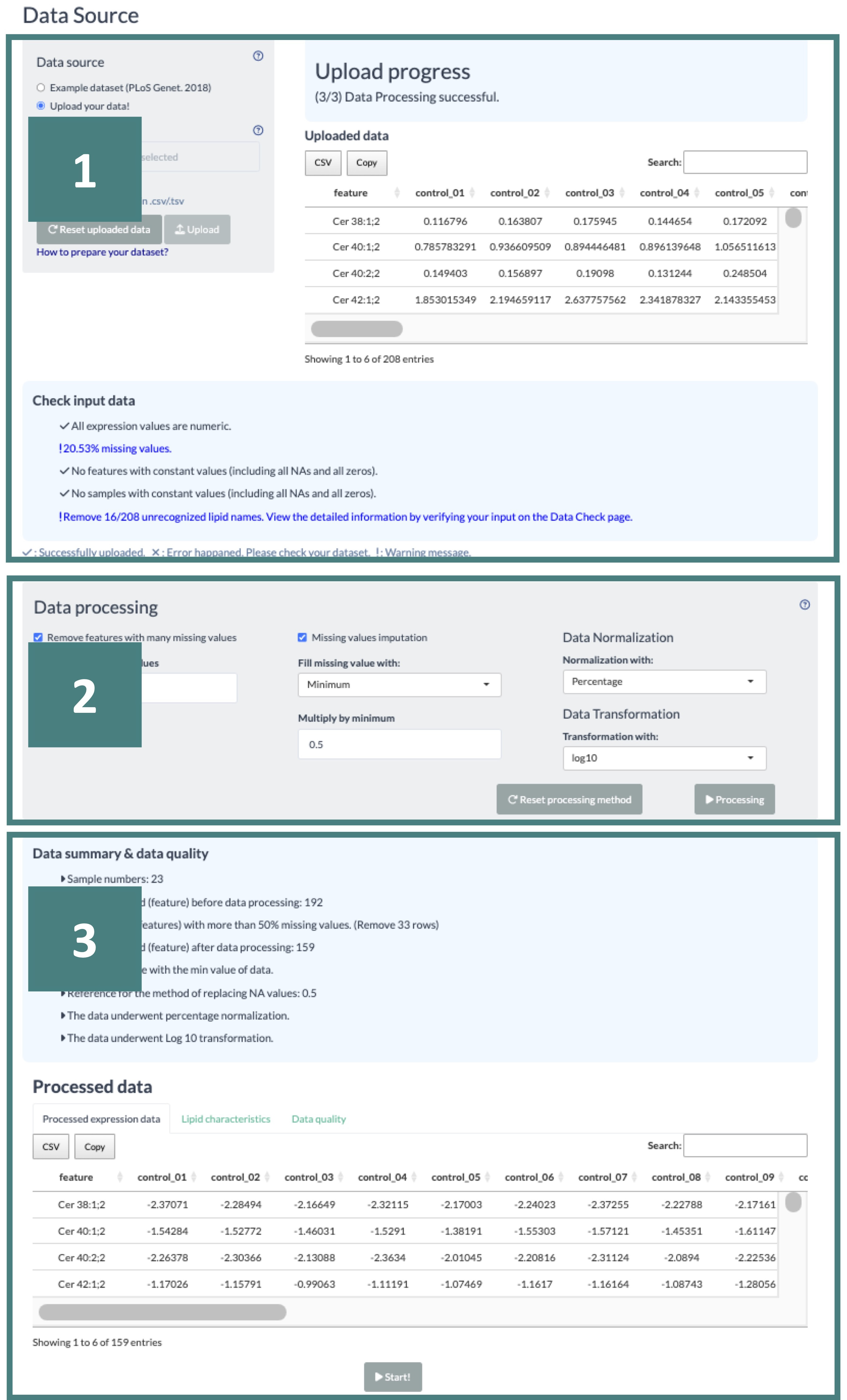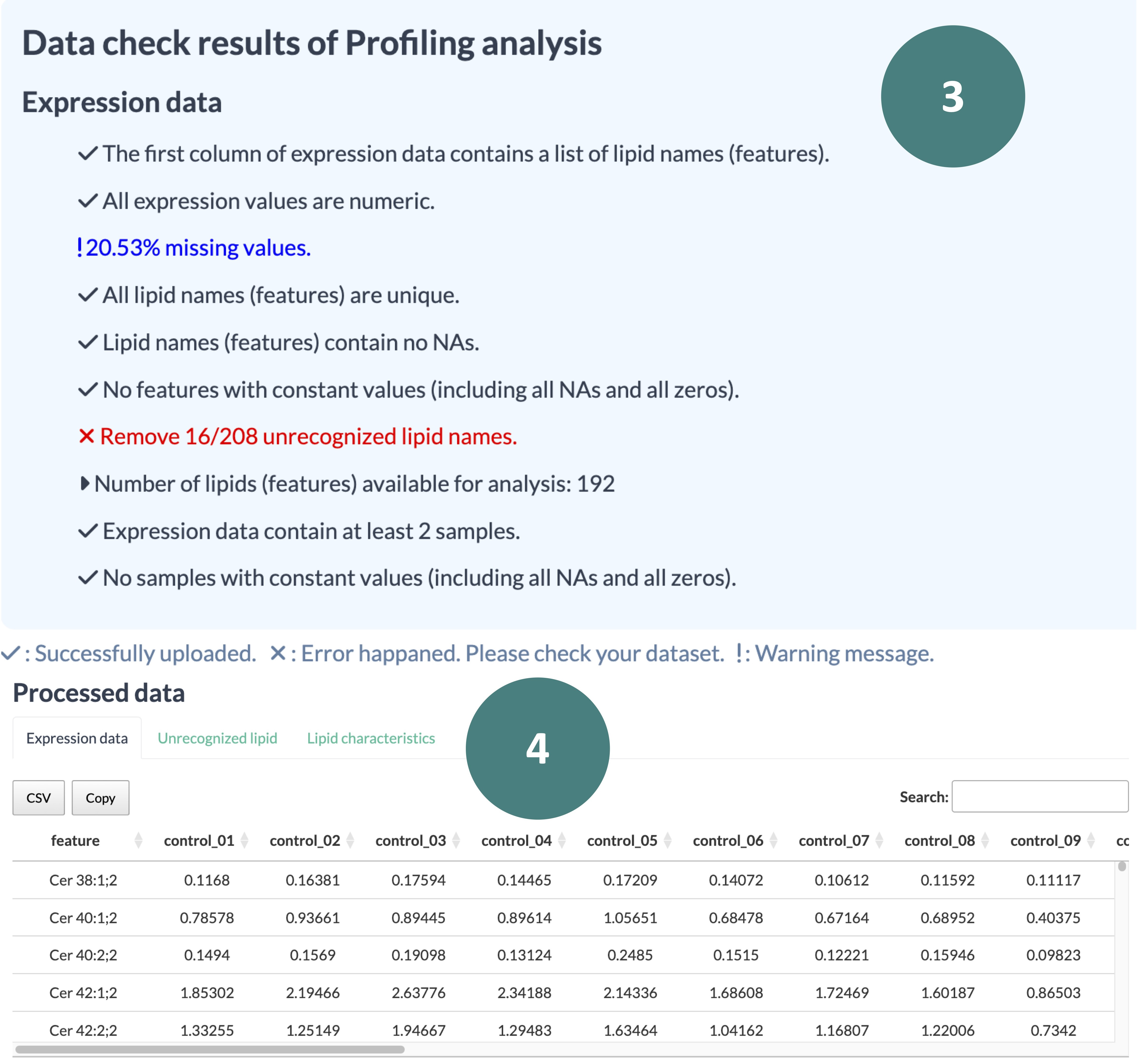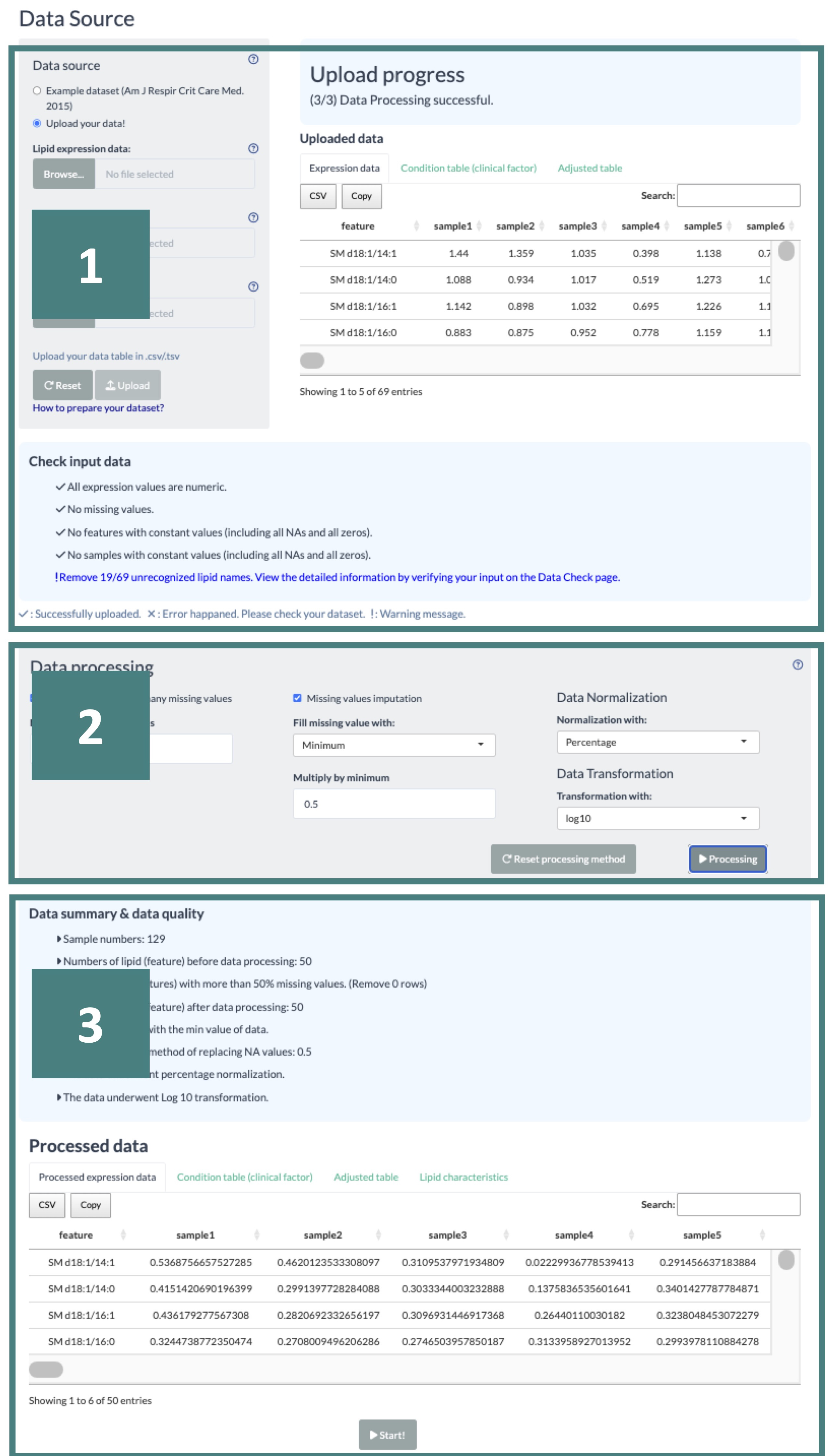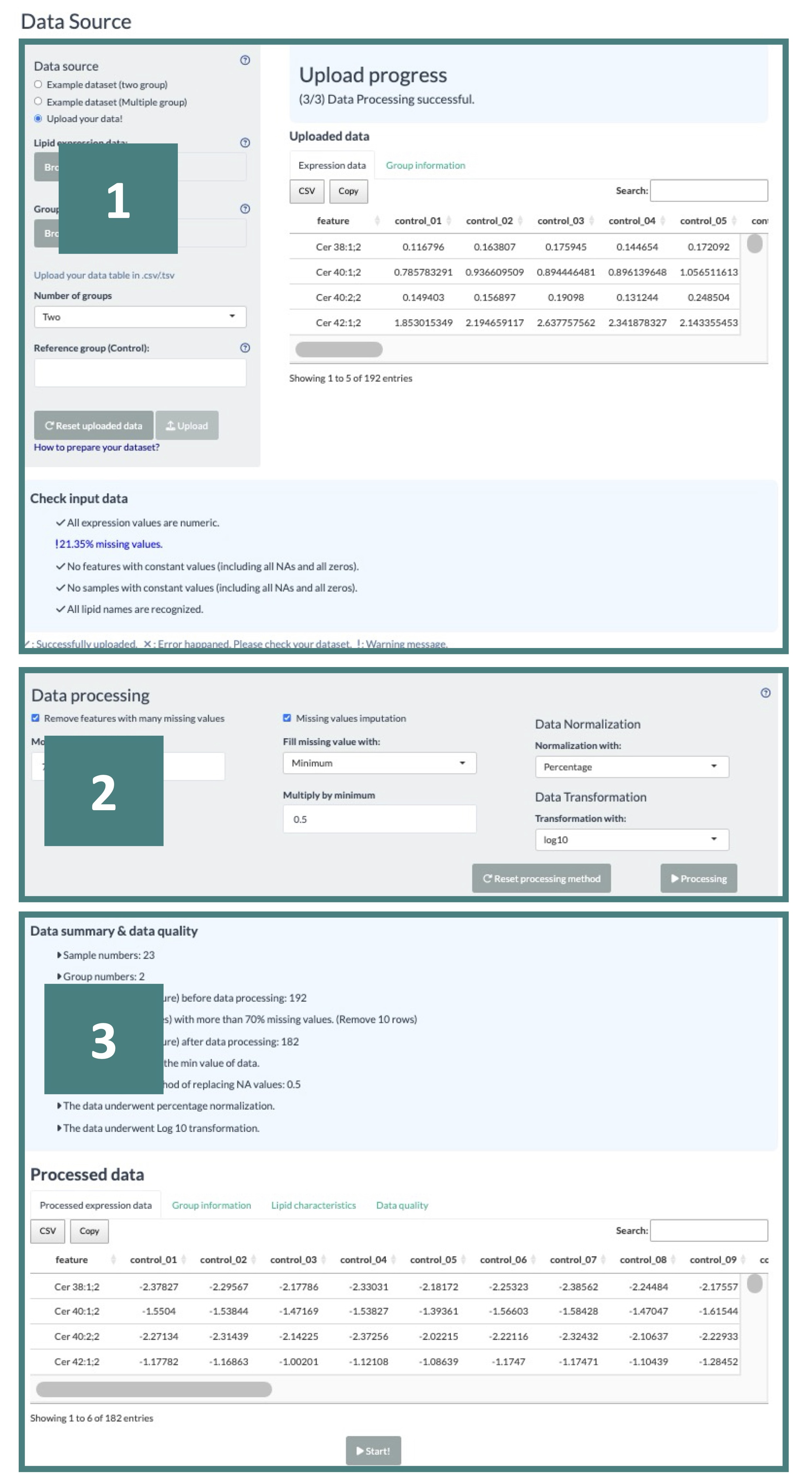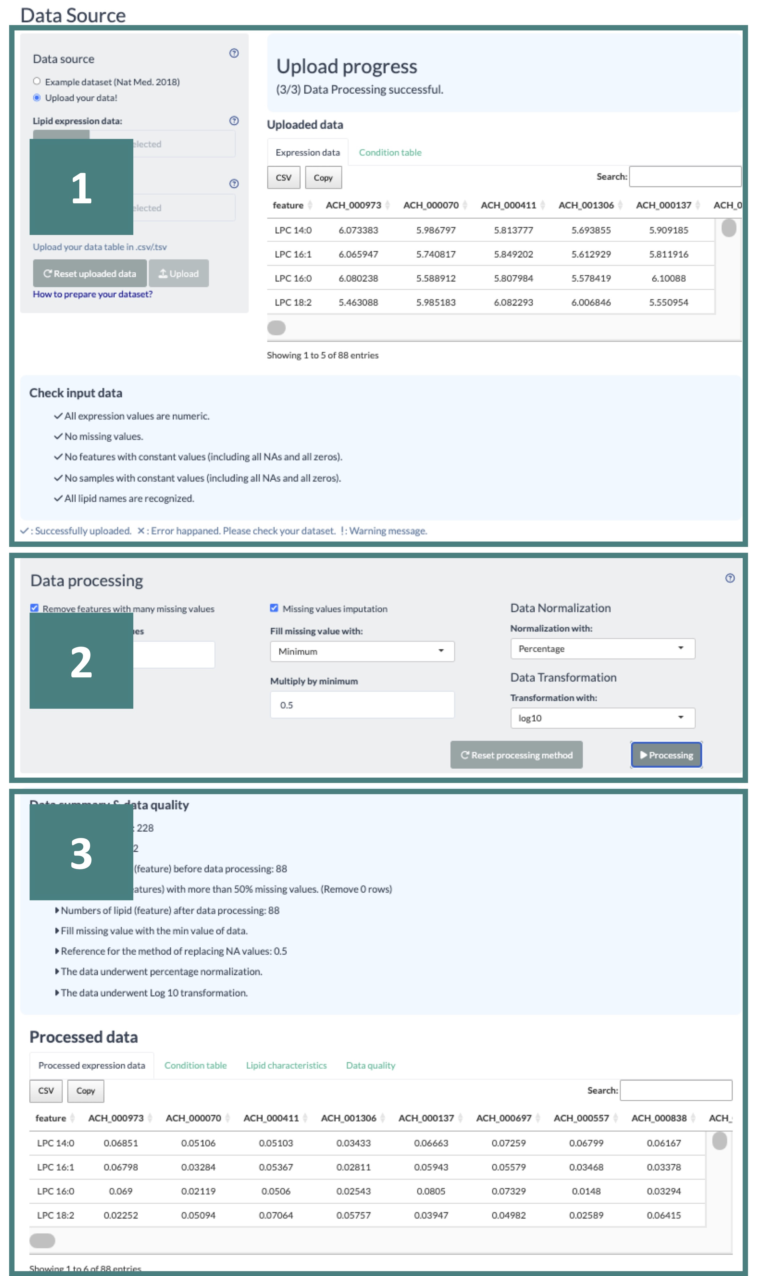 Upon selecting 'Processing,' users will receive a data summary about the processing details of uploaded data, the processed abundance data, and a conversed lipid characteristic table according to the features in the uploaded abundance data.