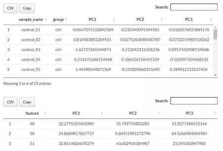 Next, two tables related to PCA are also provided for users to see the contribution to each principal component in each sample and the contribution of each feature (lipid species).