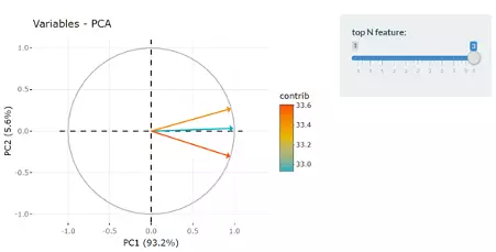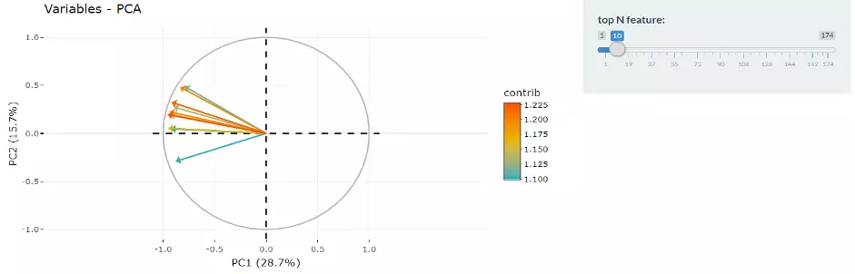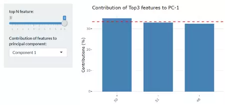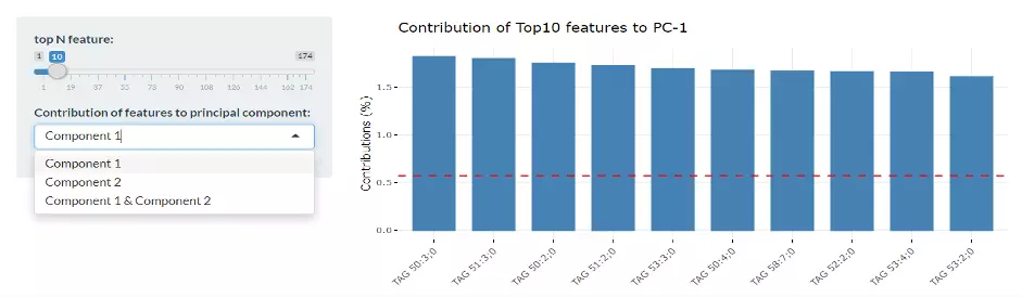 Lastly, by adjusting the slider of the top N feature on the bottom left, users can have a closer look at the contribution of features to a user-defined principal component (e.g., PC1, PC2 or PC1+PC2).