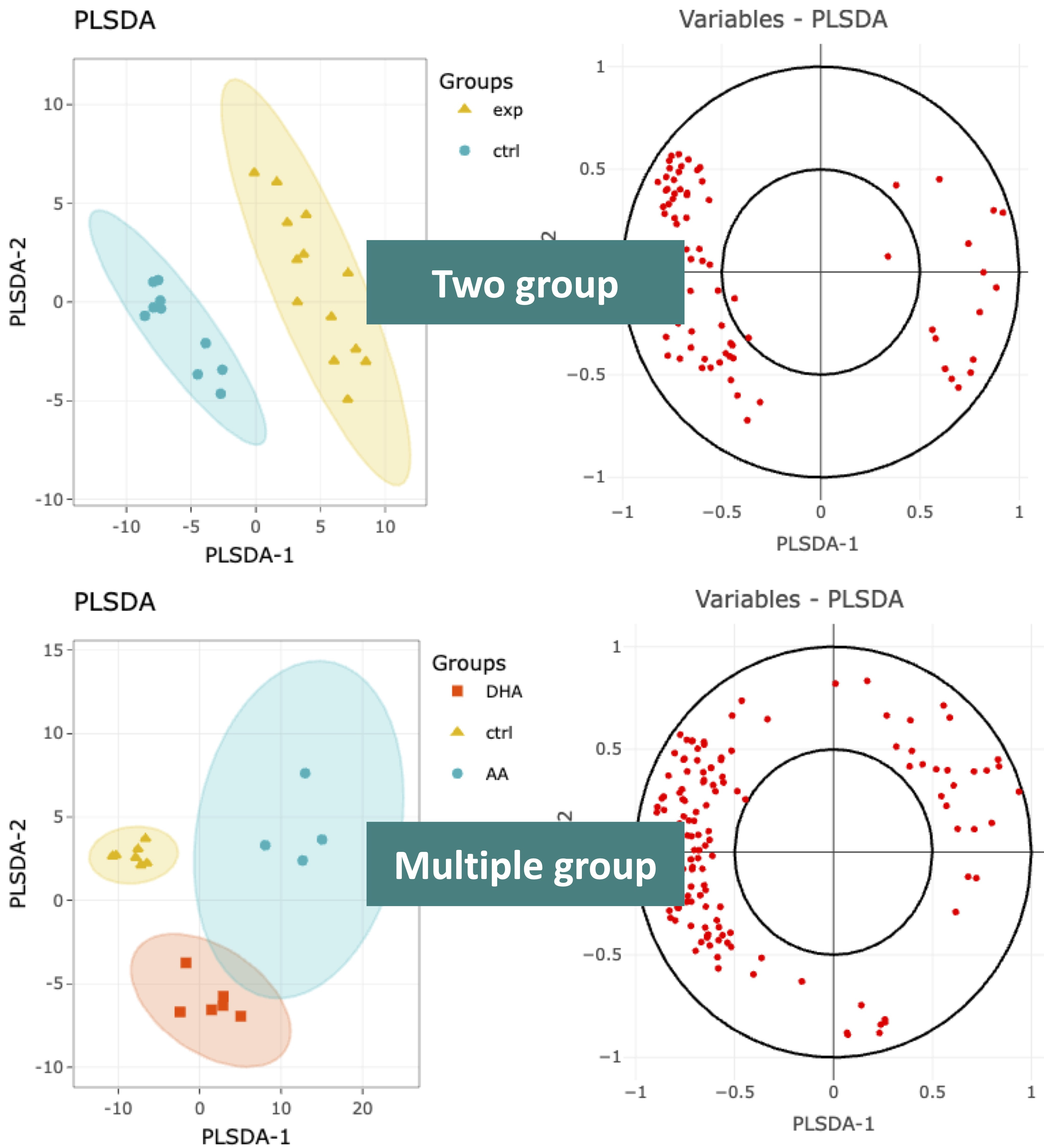 The correlation circle plot on the left will then show the correlation between a feature (lipid species) and a principal component (PC) used as the coordinates of the variable on the PC (2).