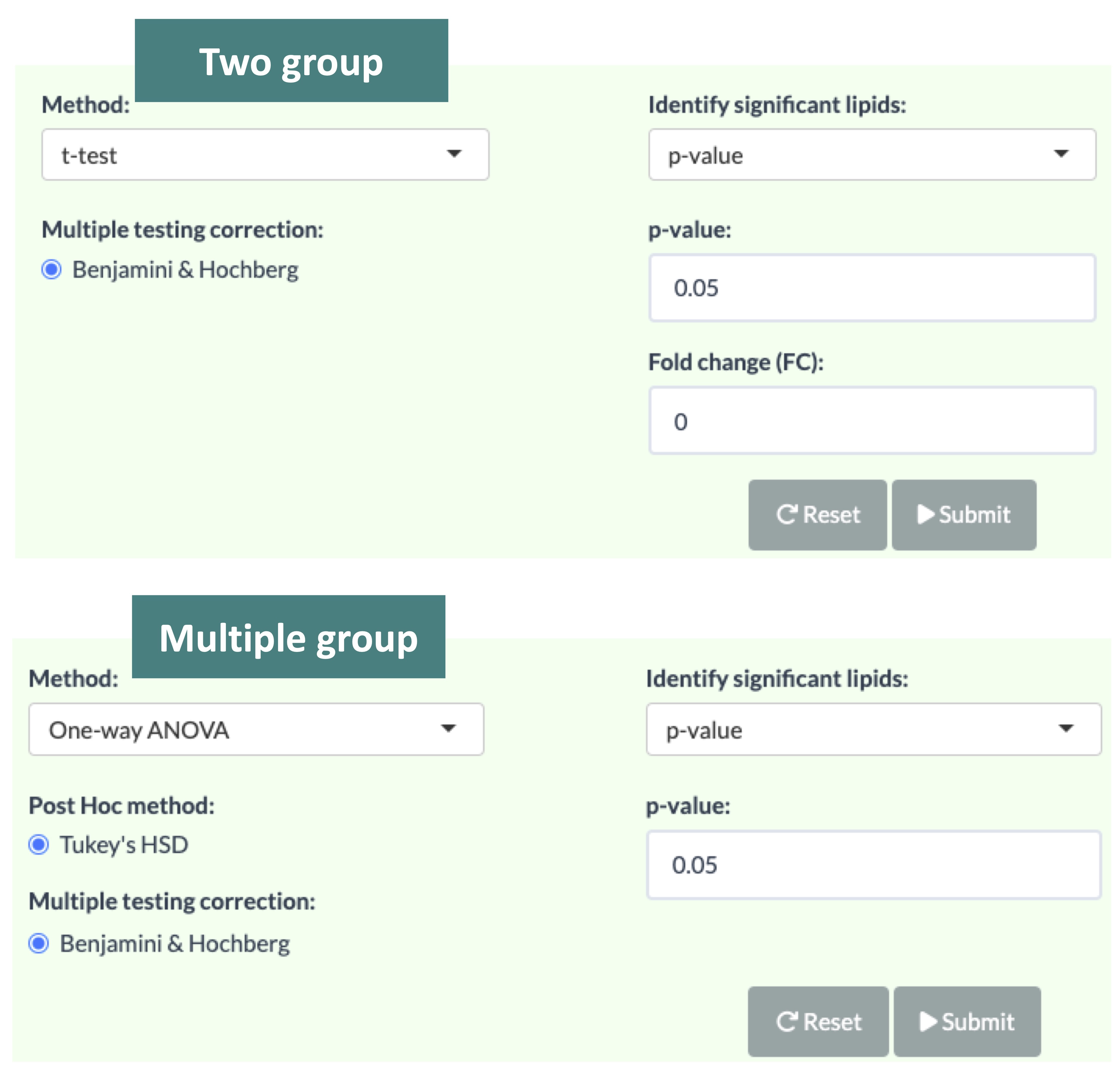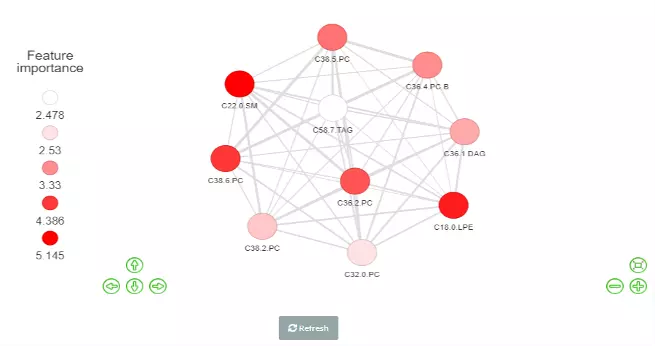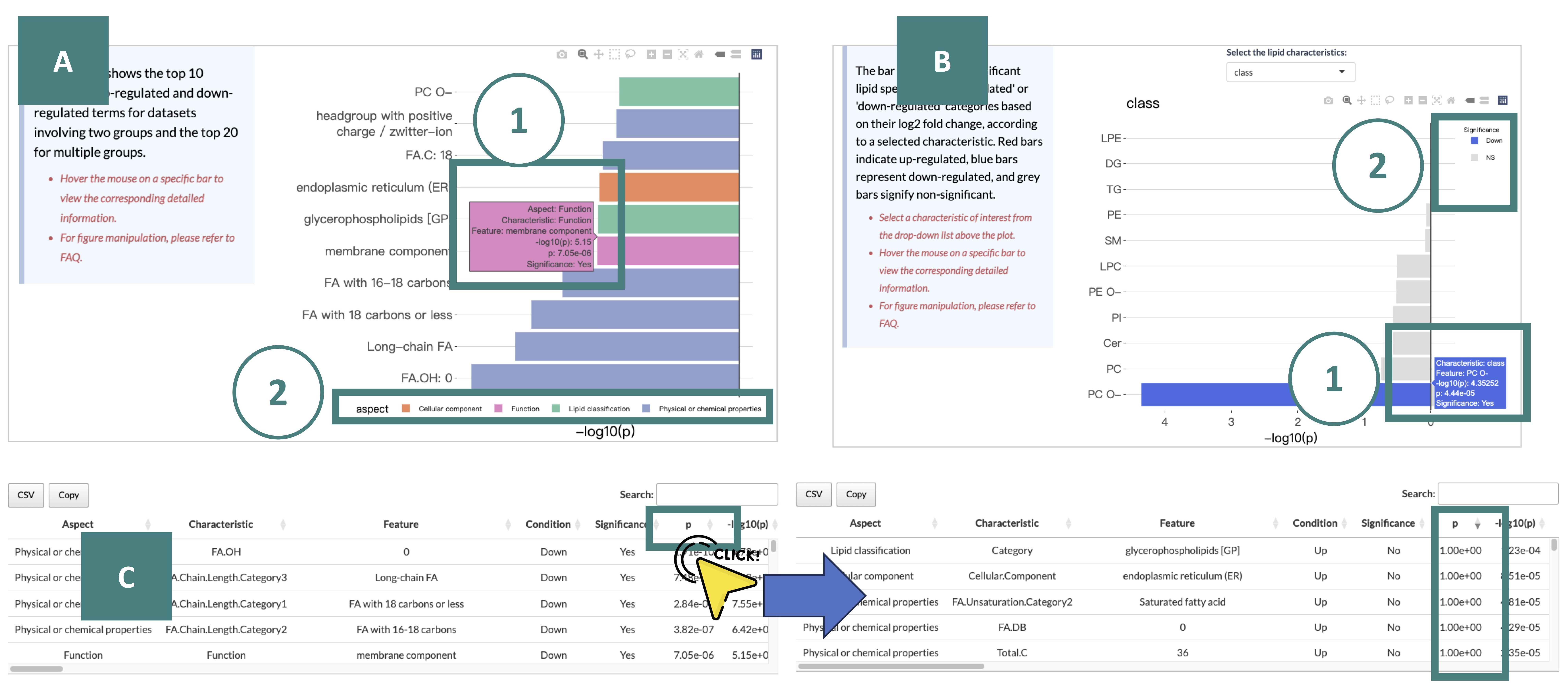 To discover the enriched pathway, the lipid classes can be chosen by users either by typing in or selecting. KEGG, Reactome, GO:BP/CC/MF are provided in this section as the database for enrichment by using Fisher’s exact test. P-value can be altered by users. The ‘Top N significant terms’ is based on the -log10(p-value),