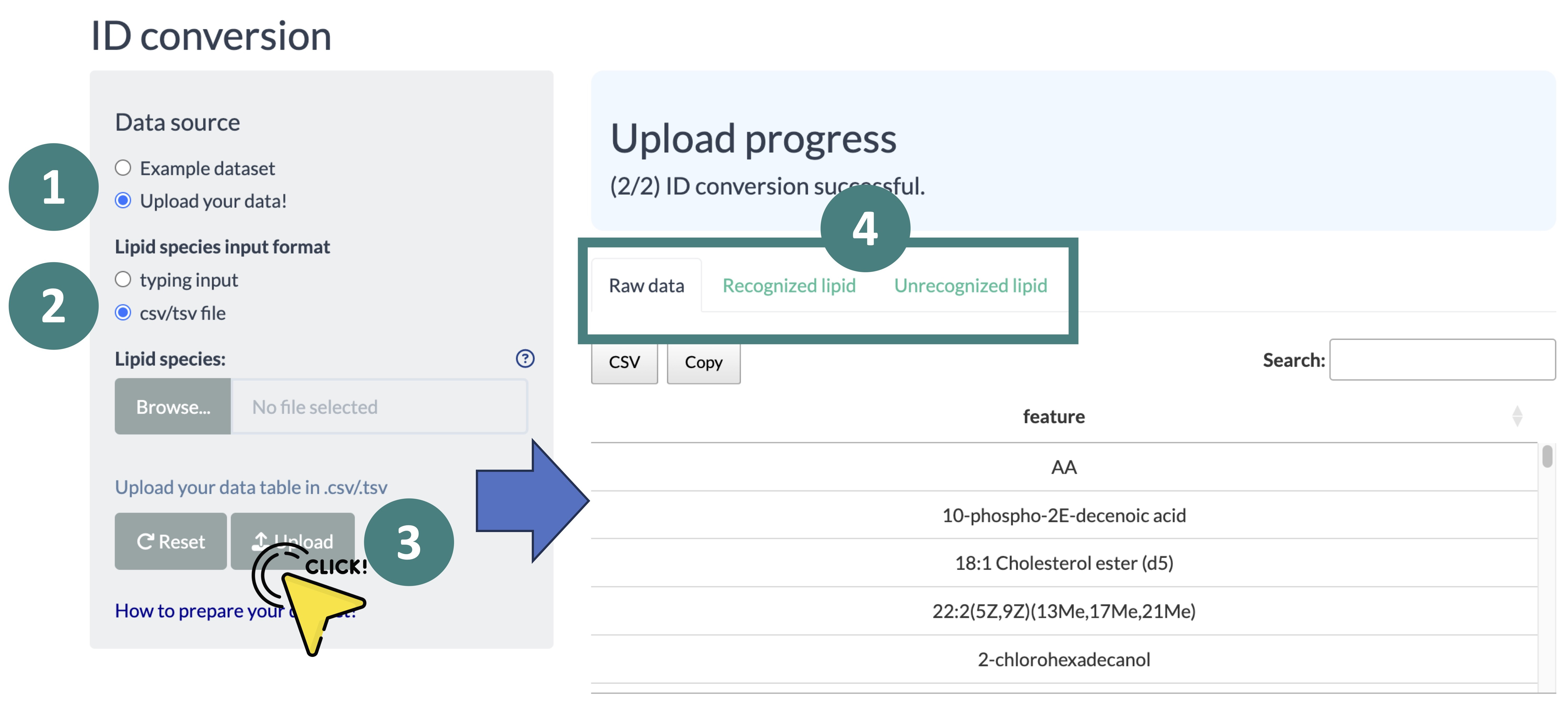 For CSV file uploads: Ensure the file contains just one " feature " column and list all lipid species names beneath it.