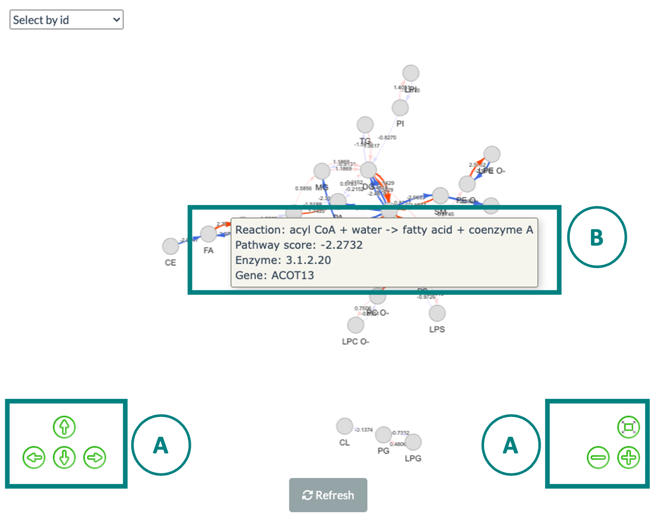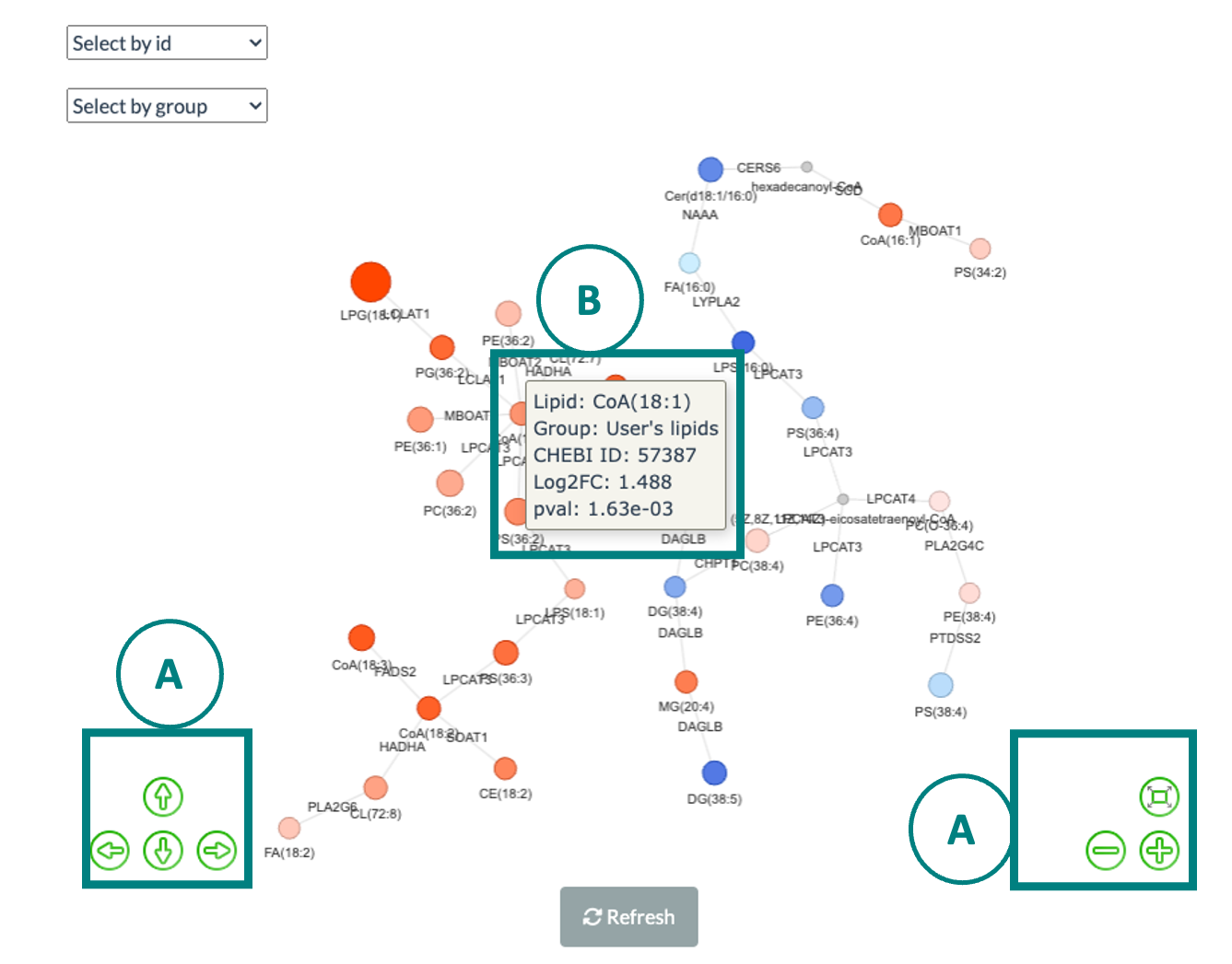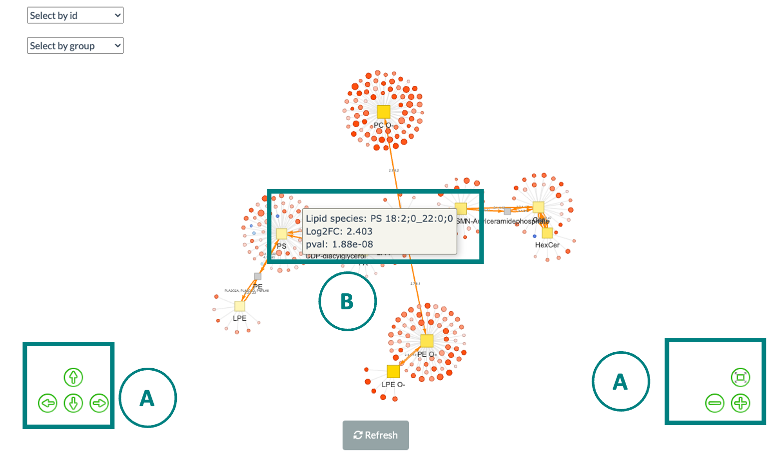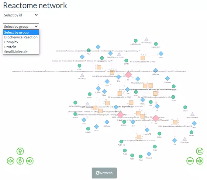 Another option is clicking on the pull-down menu at the upper left of the plot, the chosen lipid class or the whole group (of Biochemical Reaction, Complex, Protein or Small Molecule) will be highlighted.