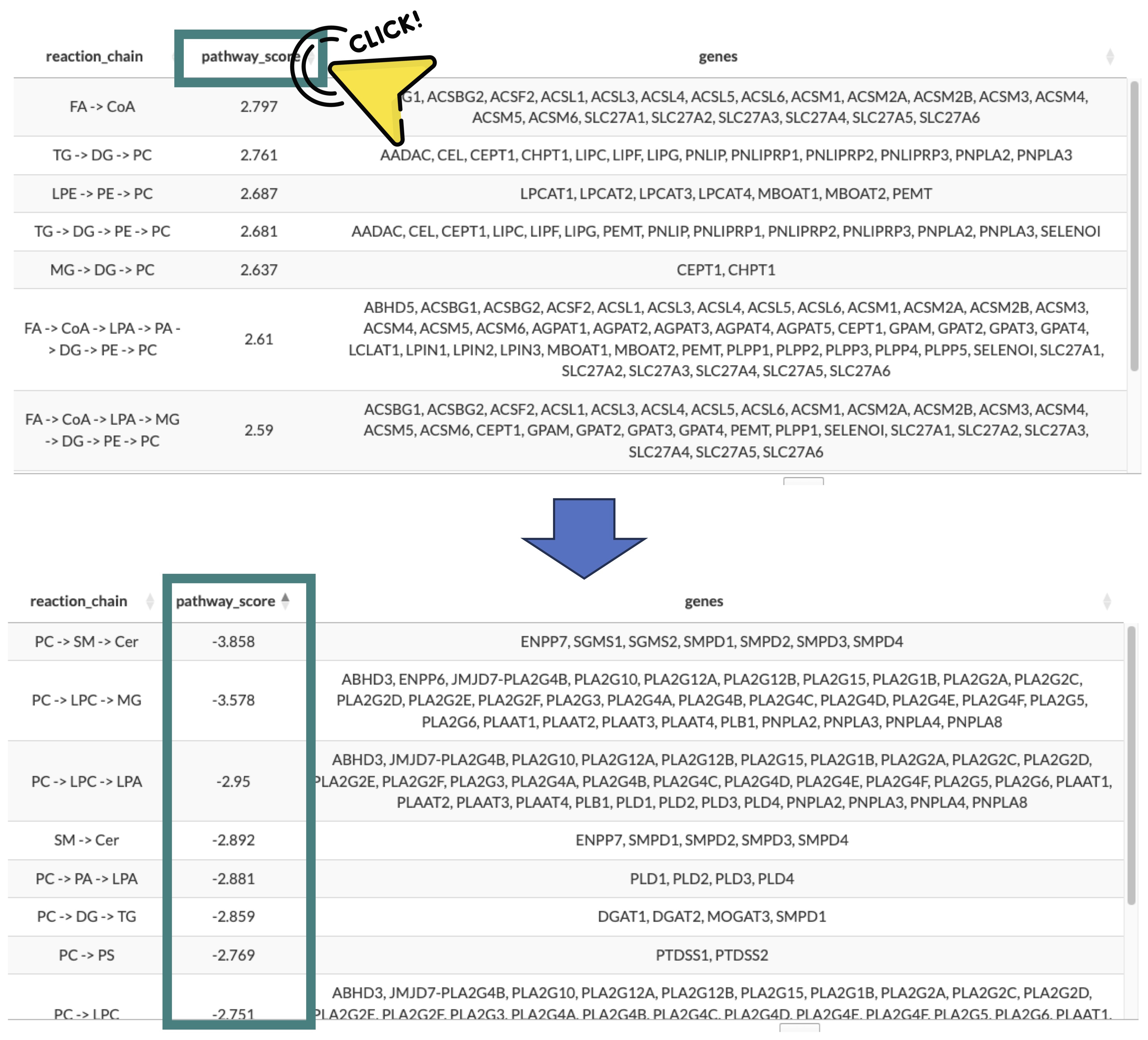 To better view the table, you can click on the column name to reorder it. For example, if you click on the column "pathway score," the values will be displayed in ascending order.