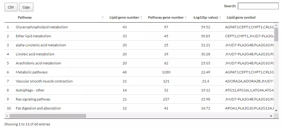 As for the table below, the first column, 'pathway' is the pathway enriched by those genes that are related to user-defined lipid classes.