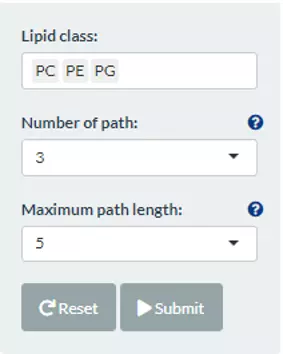 To obtain the Reactome Network, the user can define the lipid class by typing in or select from the pull-down menu. 'Number of the path' means the N shortest paths will be searched between each pair of selected lipid classes. Besides, ‘Maximum path length’ controls the maximum length of these paths and we removed those over this threshold.