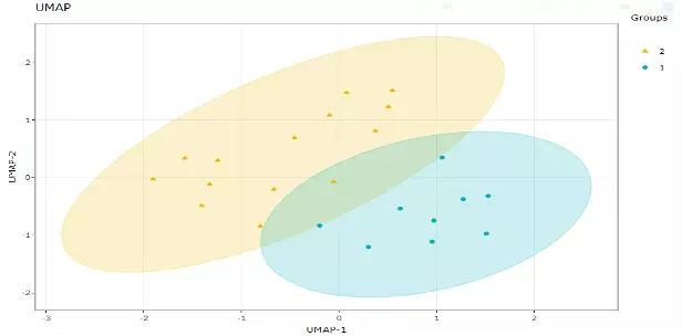 UMAP using a nonlinear dimensionality reduction method, Manifold learning, which effectively visualizing clusters or groups of data points and their relative proximities.