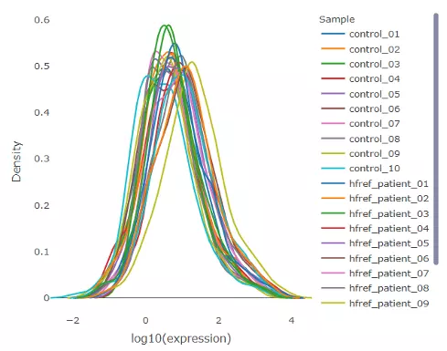 The density plot uncovers the distribution of lipid abundance in each sample (line). All abundance was log10 transformed. By hovering over the line, a box will suggest a specific abundance level and the density of the point.